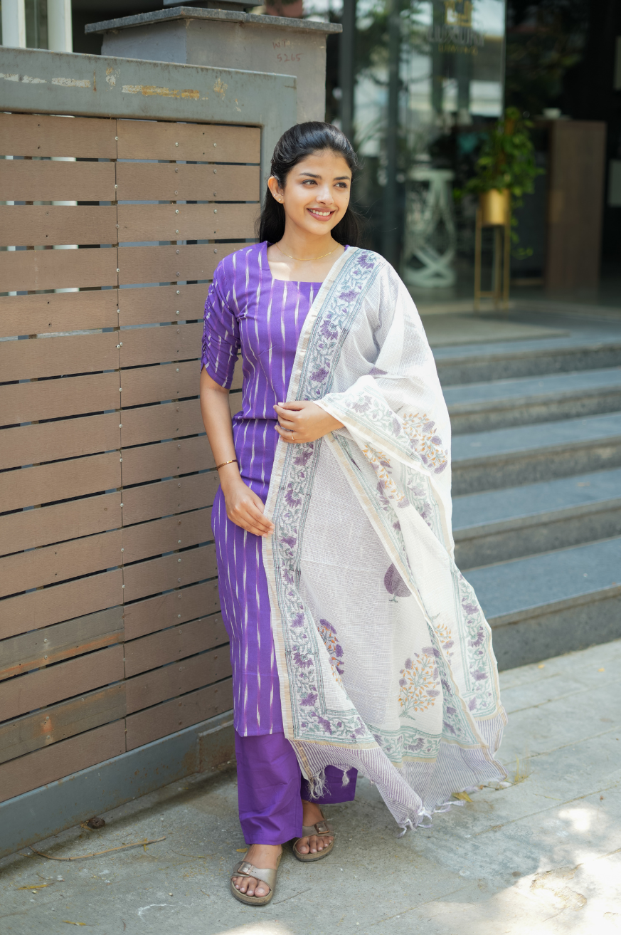 Embrace summer in comfort and style with this handloom Ikkat salwar suit set, featuring a hand block dupatta, square neck, and elbow sleeves. Paired with straight pants and multi-functional pockets for ultimate ease. Perfect for sunny days!
