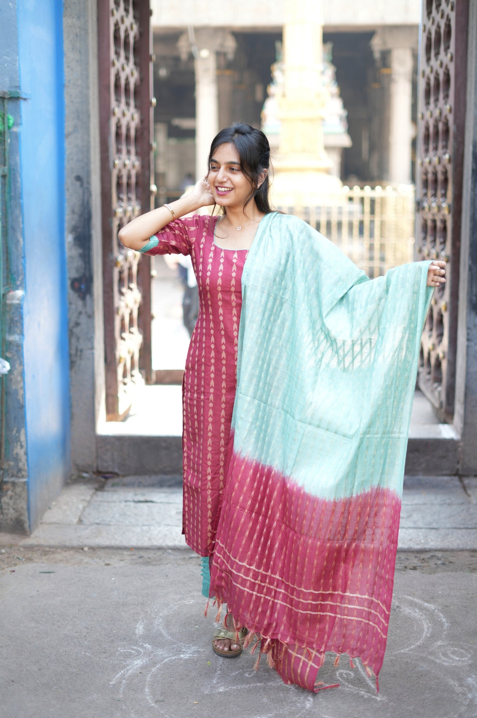 It sounds like a truly elegant silk suit set! The dual-color combination on a contrasting base must make it stand out beautifully, adding a touch of sophistication. With its versatile design, it seems perfect for any occasion, whether it’s a festive celebration, wedding, or even a formal gathering.