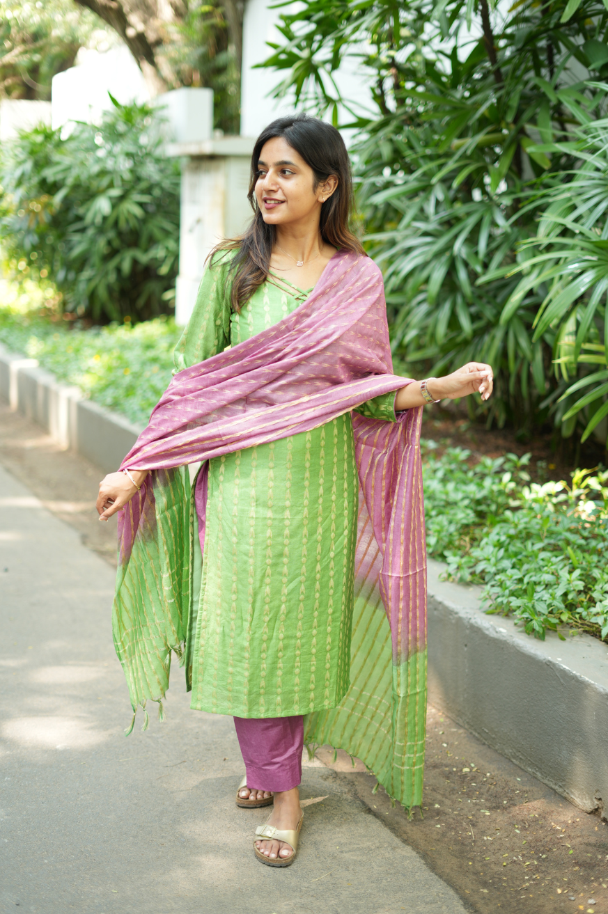 It sounds like a truly elegant silk suit set! The dual-color combination parrot green and lavender on a contrasting base must make it stand out beautifully, adding a touch of sophistication. With its versatile design, it seems perfect for any occasion, whether it’s a festive celebration, wedding, or even a formal gathering.