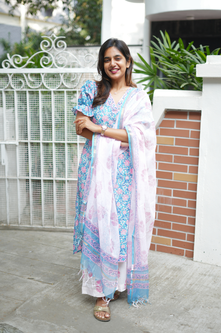 A stylish cotton floral-printed suit set featuring puff sleeves, palazzo pants with a multi-purpose pocket, and a breathable Kota Doria dupatta. A perfect blend of comfort and elegance for any occasion.