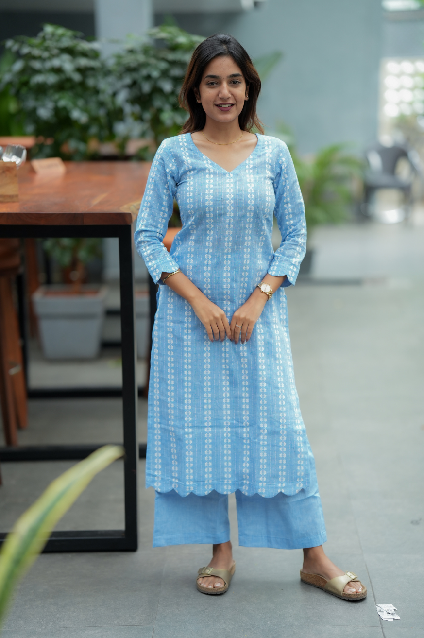 Design -Curved V neck with scalloped 3/4 sleeves with scalloped hemline