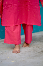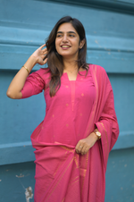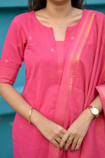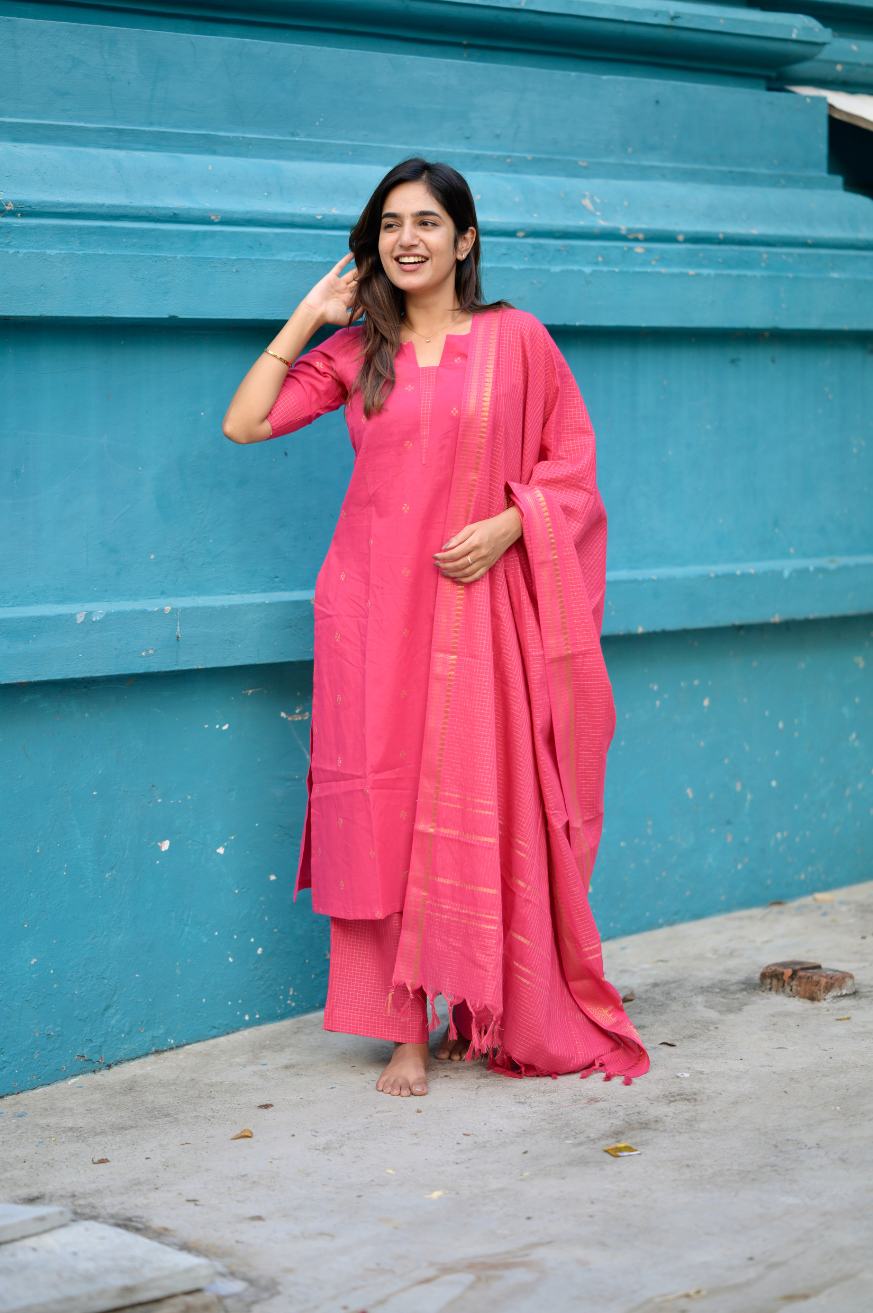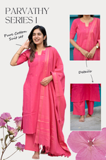 Parvathy - Pure handloom cotton suit with golden woven butta , 11 in sleeves Kurtha with smart neckline patten , straight pant with multifunctional pocket