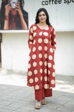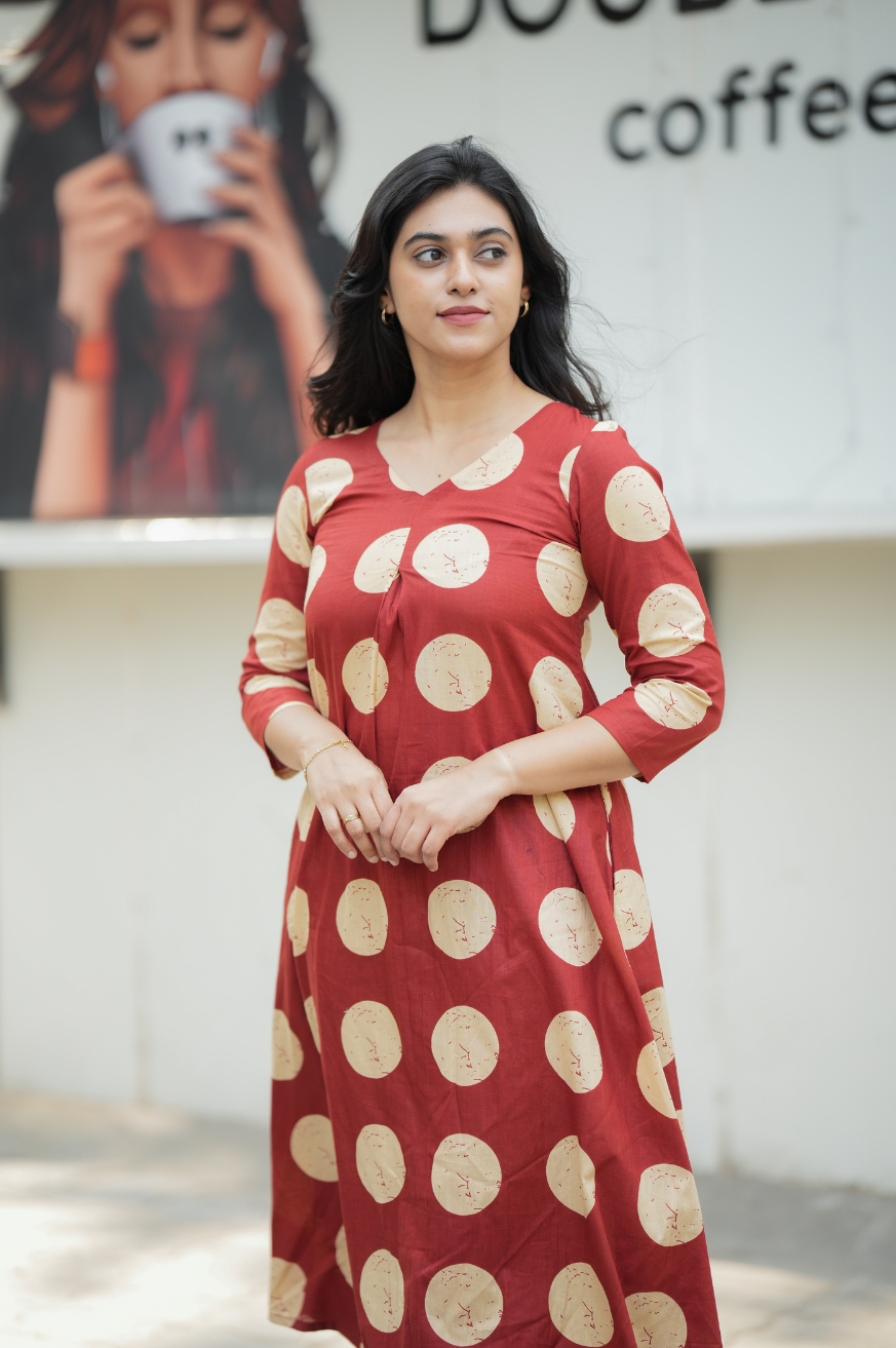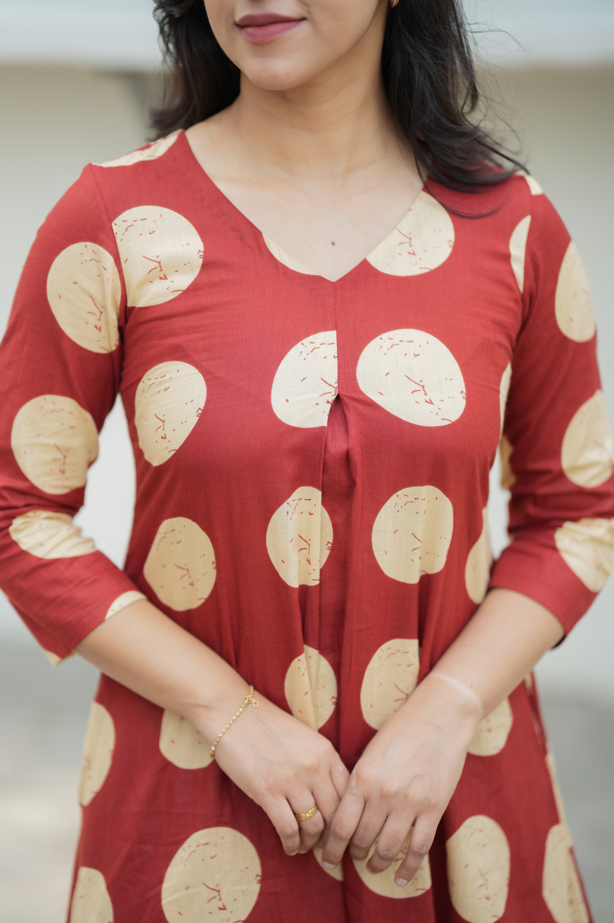 With wide polka dots all over designed with inverted pleat with v neckline and 3/4 sleeves