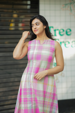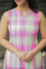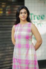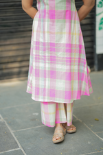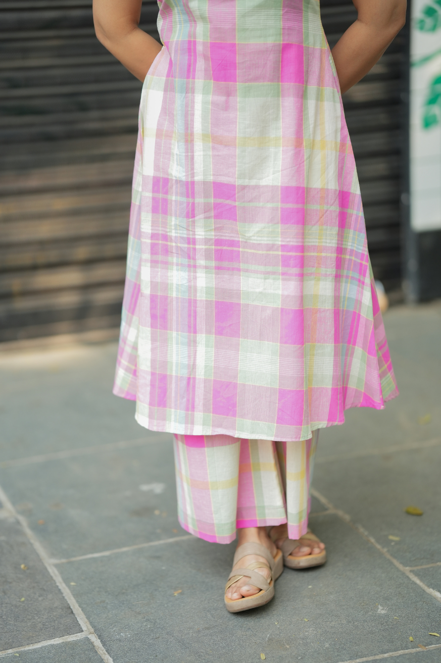 Pure cotton in multicolor checks, crafted into a sleeveless A-line top with 10-inch detachable sleeves and comfy pockets for everyday ease. Paired with a straight palazzo for effortless comfort and elegance.