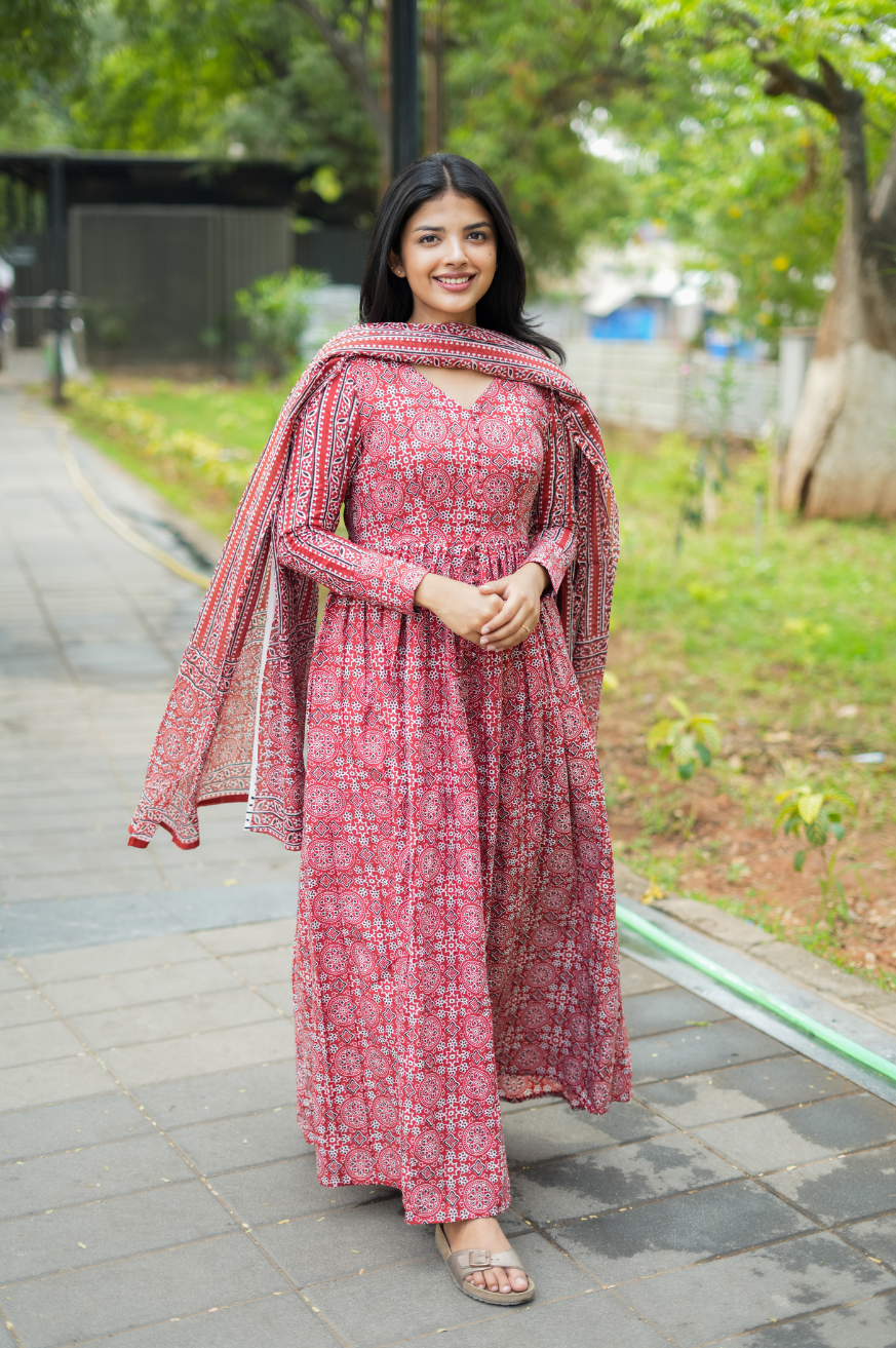 Pure cotton Ajrak printed 3 piece Anarkali set